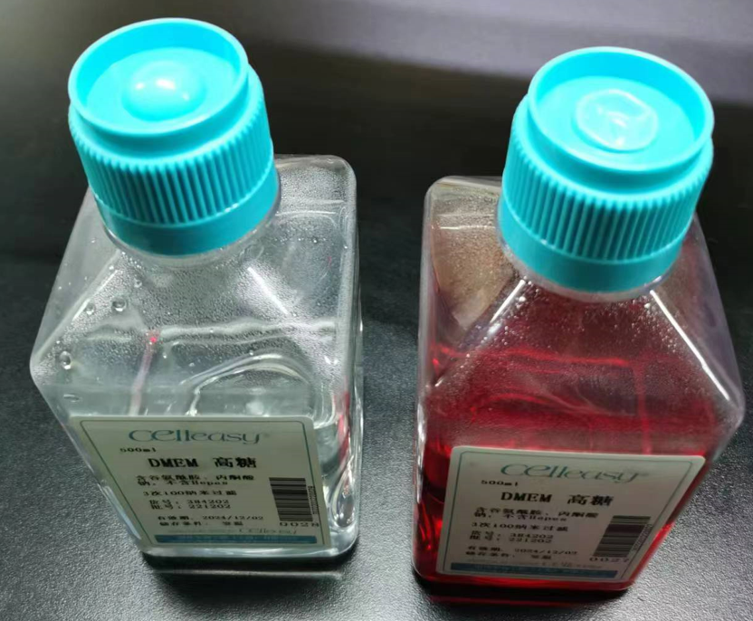 Celleasy液体培养基使用前是无色透明状,把水溶液中不稳定的谷氨酰胺、核黄素、色氨酸和指示剂酚红以干粉的形式密封在瓶盖的夹层中。使用前需要按压顶部圆形凸起,用力摇晃混匀呈红色,就可以正常使用了。